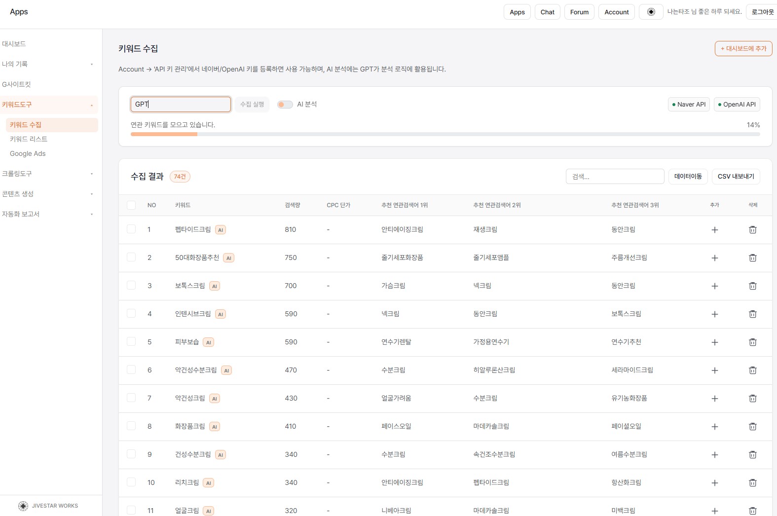 무언가를 자동으로 만들어준다는 말은 이제 너무 흔하다. 진짜 필요한 건, 지금 뭘 먼저 봐야 하는지 덜 헷갈리게 해주는 구조다. 키워드분석 결과를 그냥 쌓아두는 게 아니라, SEO 흐름 안에서 정리하고, 마케팅 목적에 맞춰 우선순위를 나누고, AI분석으로 다시 해석해보는 과정. 그게 붙어야 비로소 도구가 실제 일에 들어온다.